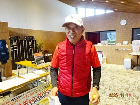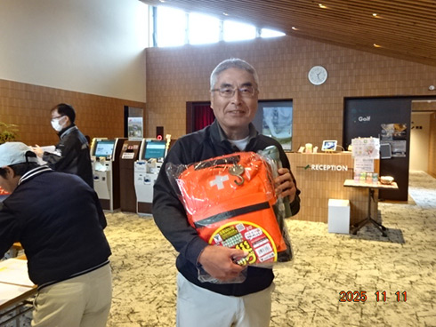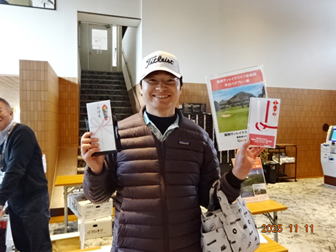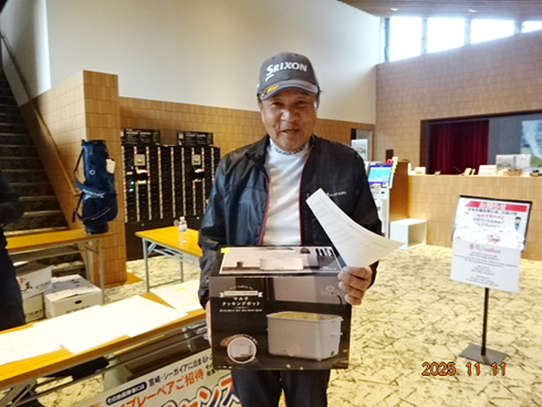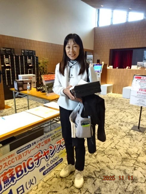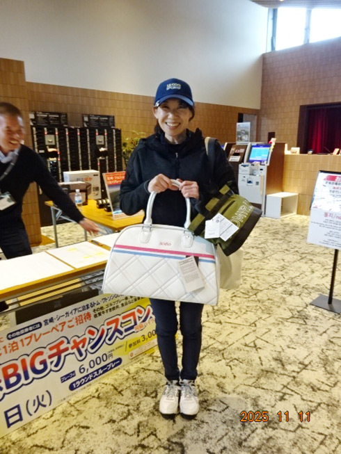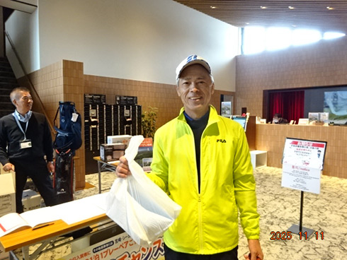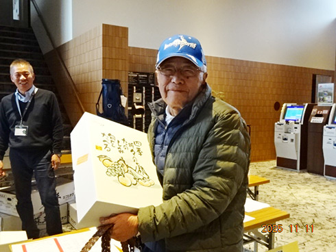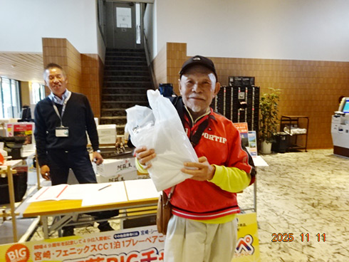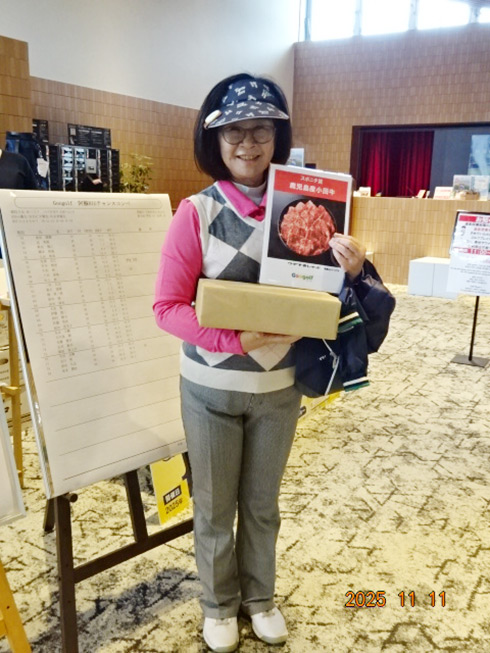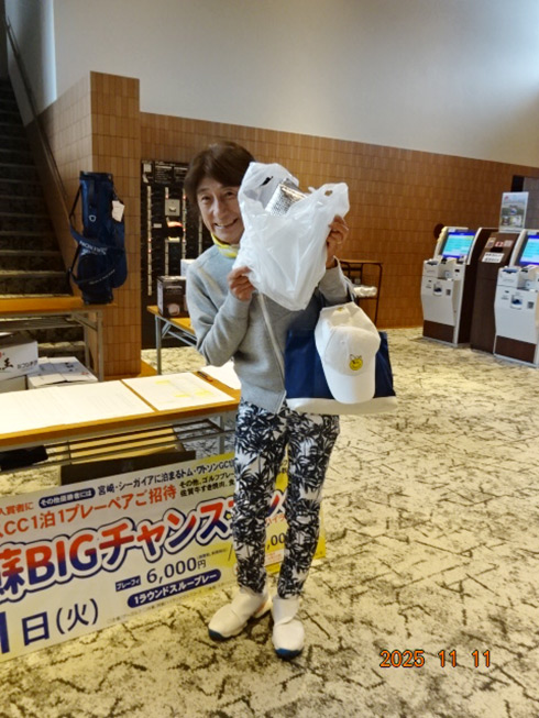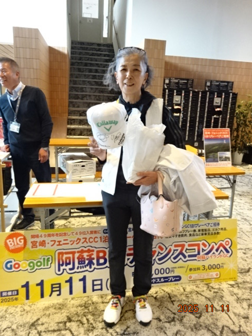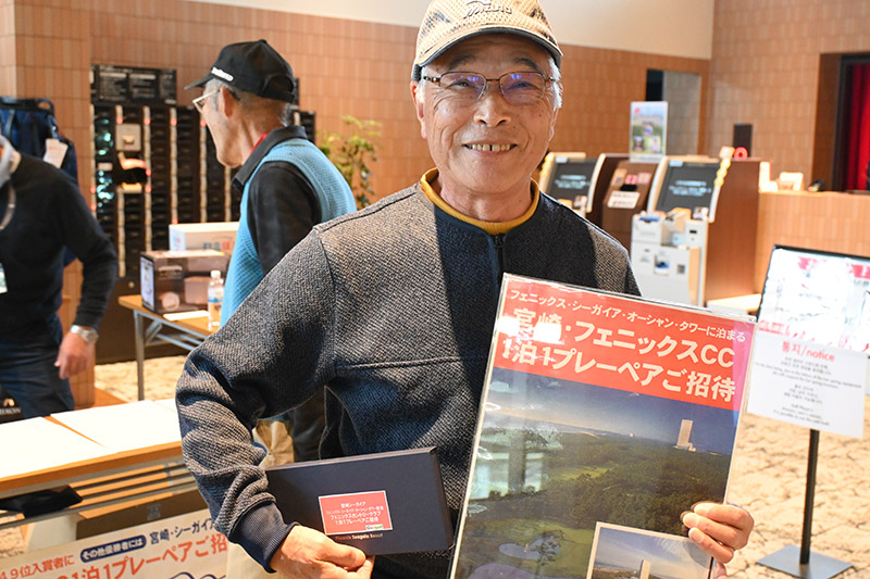 超目玉の同コース開場49周年記念として用意された49位の「宮崎フェニックスCC1泊1プレーペアご招待」を手にしたのは、大分県から参加した廣瀬和美さん(78)。「参加賞で貰うすき焼き肉でいいかなと思って参加したのですが、まさかこんな大きな賞が当たるなんて」と驚いた様子。「昔は年間80ラウンドとか回ってたけど、最近は40ラウンドかな」とまだまだお元気。「目標は86歳まで、あと8年頑張ってラウンドしたいですね」と健康のためのゴルフを強調していた。