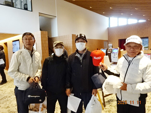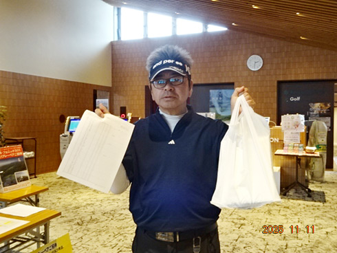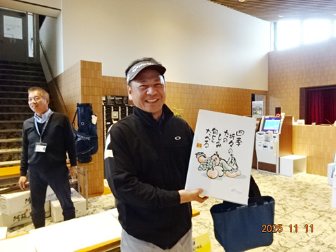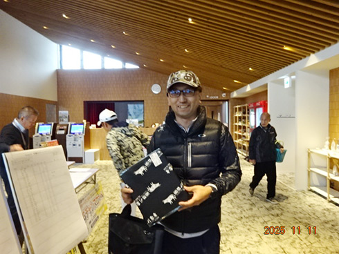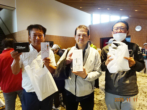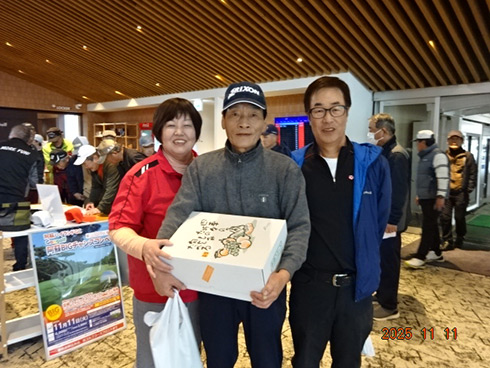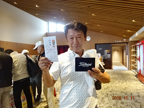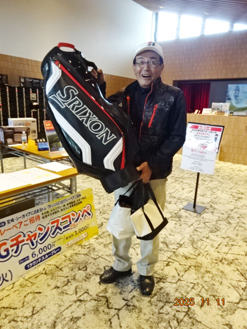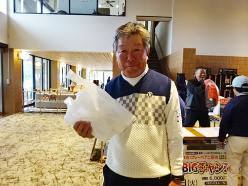 優勝したのは、単身赴任先の大分から参加した小杉太津朗さん(57)。前半43でラウンド、隠しホールがはまり、ネット33.4とぶっちぎりの頂点に立った。「前半9を叩いて、がっくりでしたが、そこが隠しホールにはまったみたいですね」とラッキーを強調。宮崎トム・ワトソンGC1泊1プレーペアご招待を受賞した。