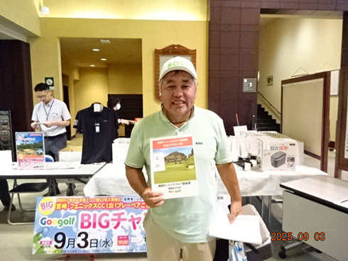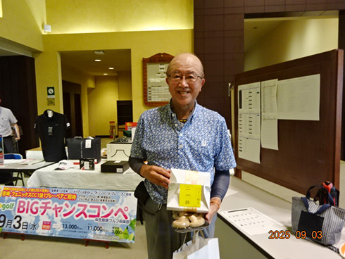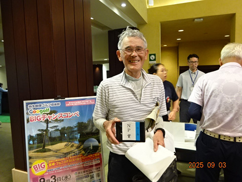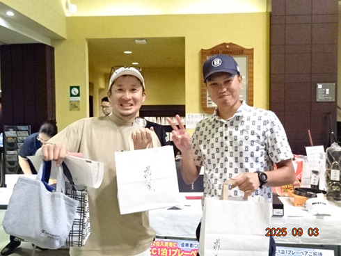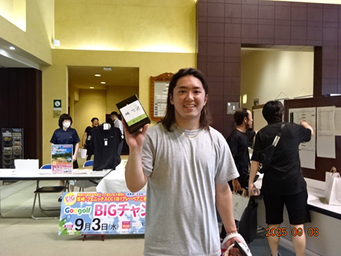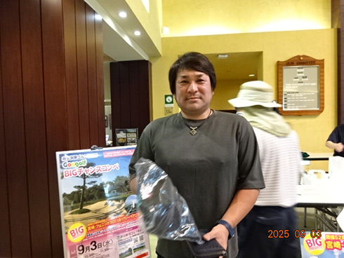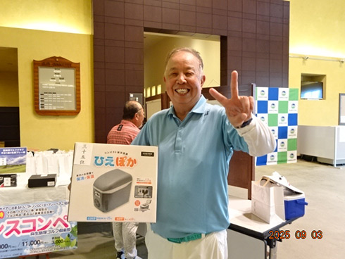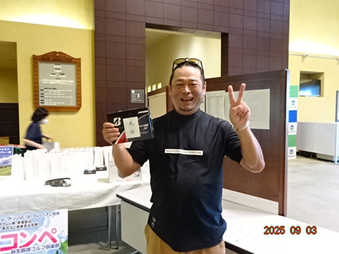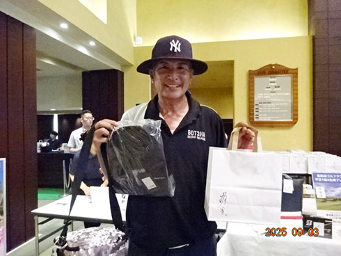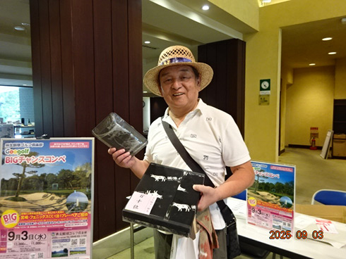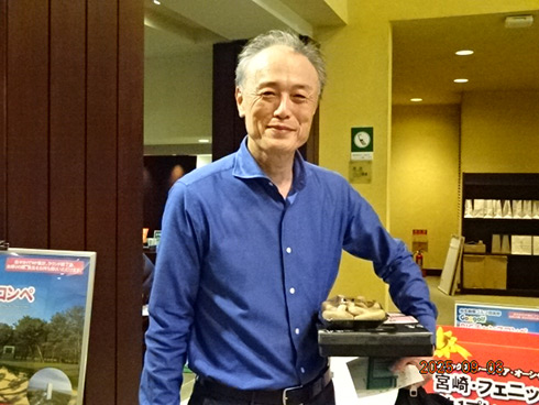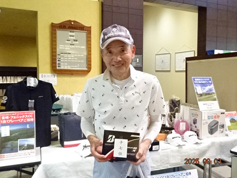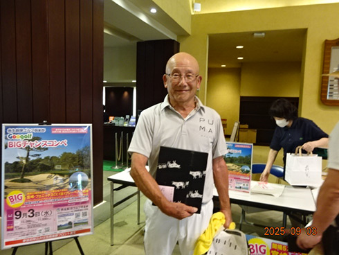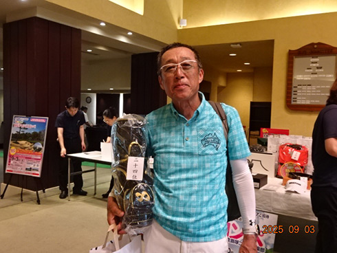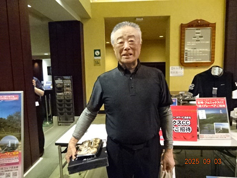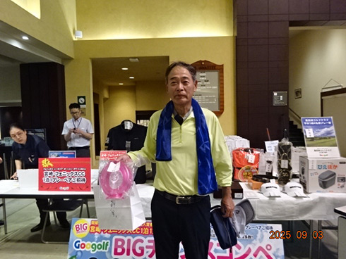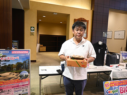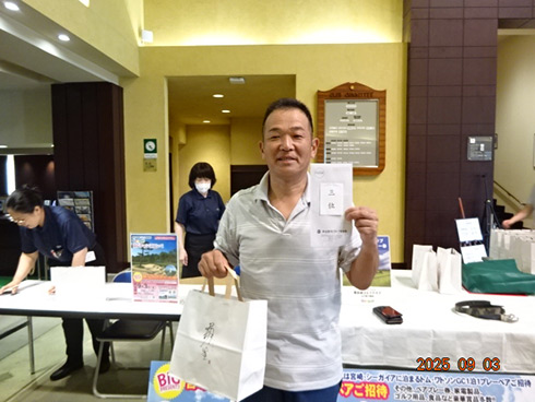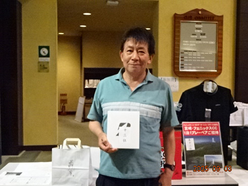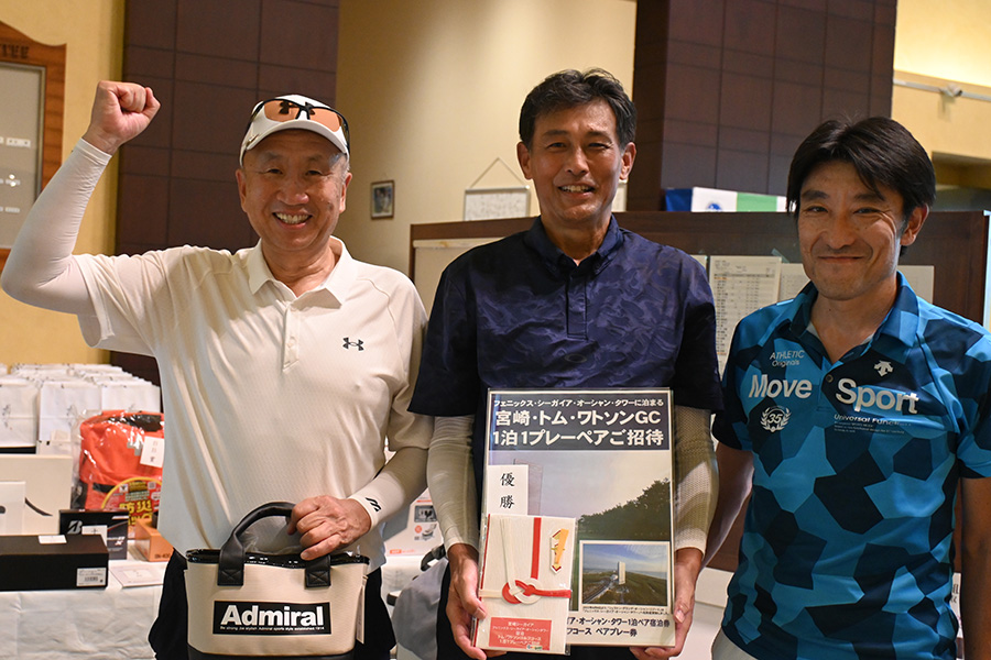 優勝したのは、福岡県春日市から参加した湯野宮康夫さん(62)。前半40でラウンドした湯野宮さんには宮崎・フェニックス・シーガイア・オーシャン・タワーに泊まるトム・ワトソンゴルフコース1泊1プレーペアご招待が贈られ、「今日は出来過ぎです。宮崎出身なのですが、トム・ワトソンGCはまだラウンドしたことはありません。グーゴルフコンペは初めて参加しました。みんなを誘って宮崎ゴルフを楽しんできます」と思いがけない優勝に驚いた様子だった。
