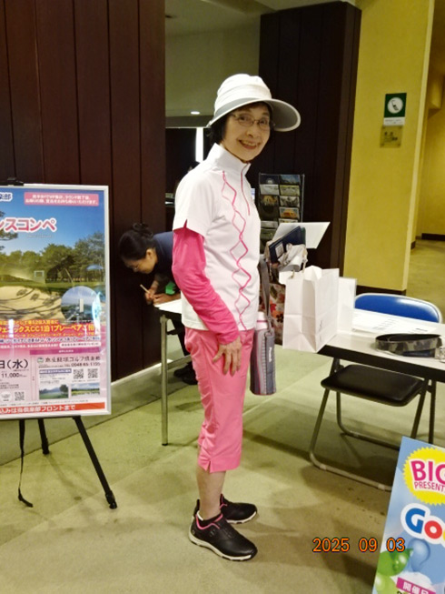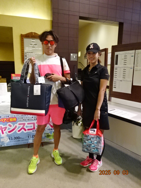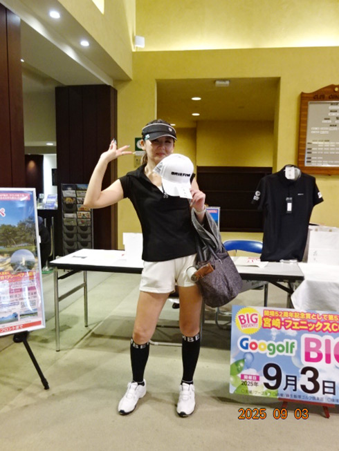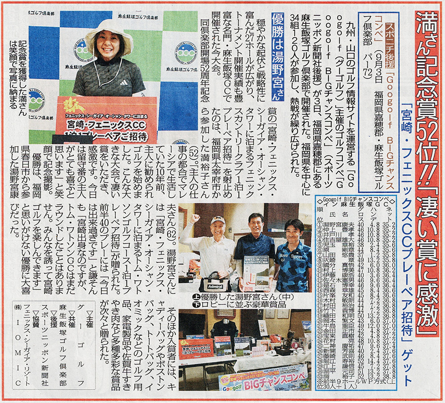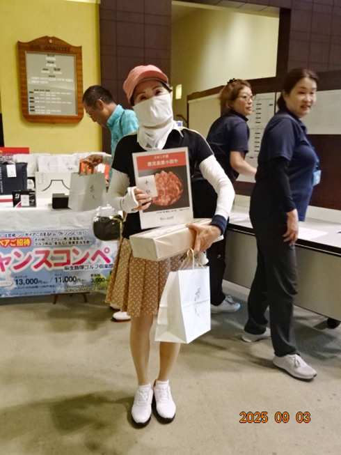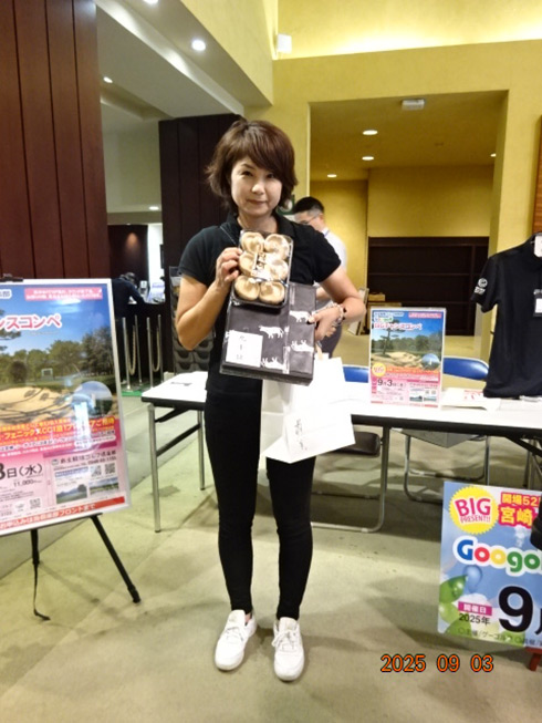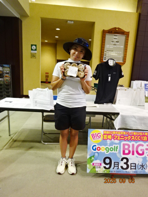 同倶楽部開場52周年記念賞の「宮崎・フェニックス・シーガイア・オーシャン・タワーに泊まるフェニックスカントリークラブ1泊1プレーペアご招待」を射止めたのは、福岡県太宰府市から参加した満裕子さん(52)。「10年前、主人の仕事の都合で、マレーシアで生活し、そこで主人に進められゴルフを始めました。こんな大きな大会で凄い賞をいただき、感激です。今日は留守番の主人がめちゃ喜ぶと思います」と笑顔で記念撮影。
