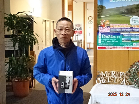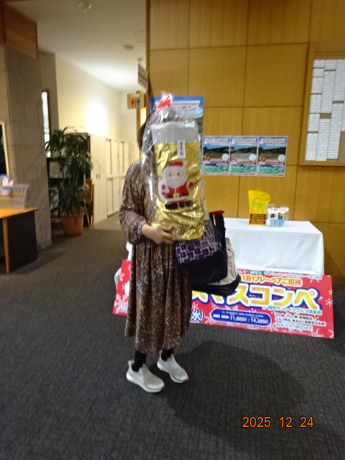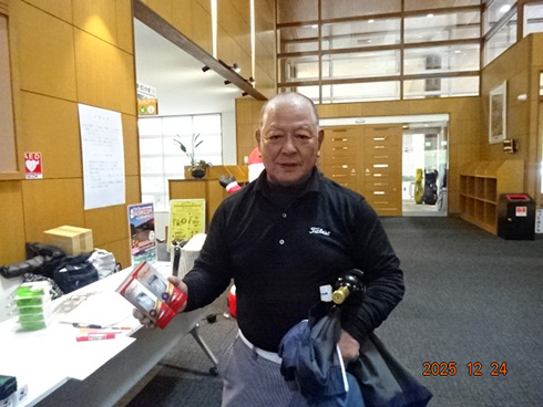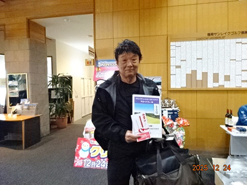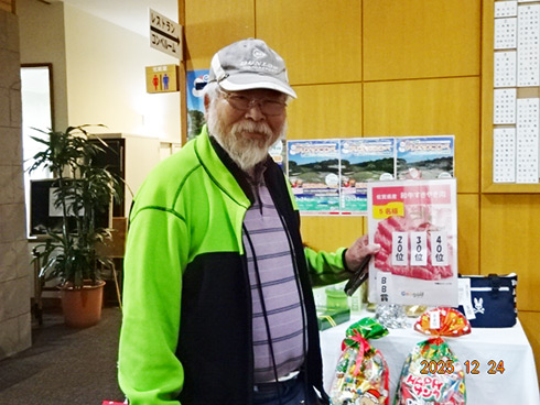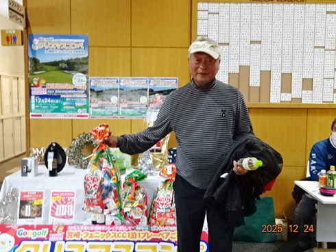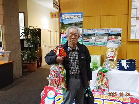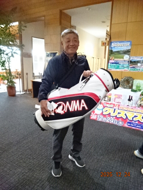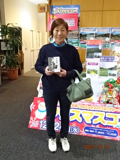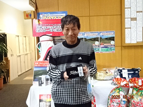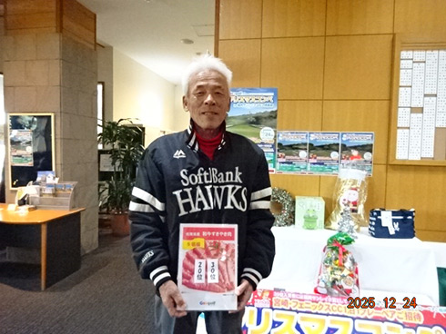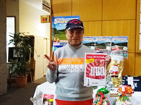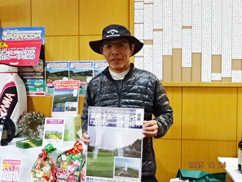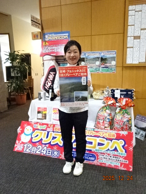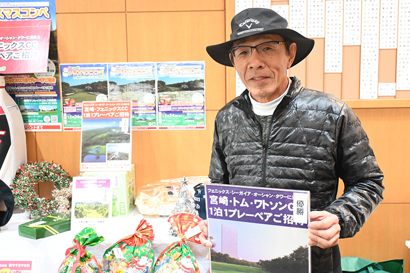 また、優勝して「宮崎・フェニクス・シーガイア・オーシャン・タワーに泊まるトムワトソンGC1泊1プレーペアご招待」をゲットしたのは福岡県久留米市から参加の寺島雅弘さん(69)。前半41のスコアでネット33.8と文句なしの頂点に立った。ベストスコアは76という寺島さん「ありがとうございます。素晴らしいクリスマスになりました」と笑顔の記念撮影。