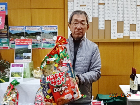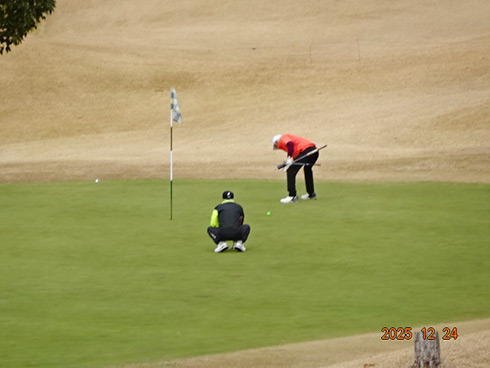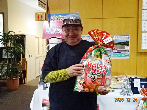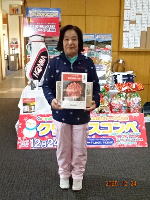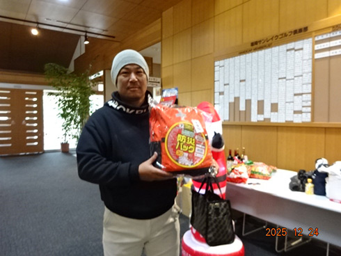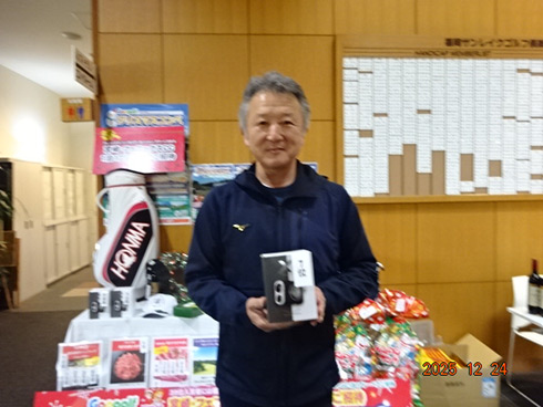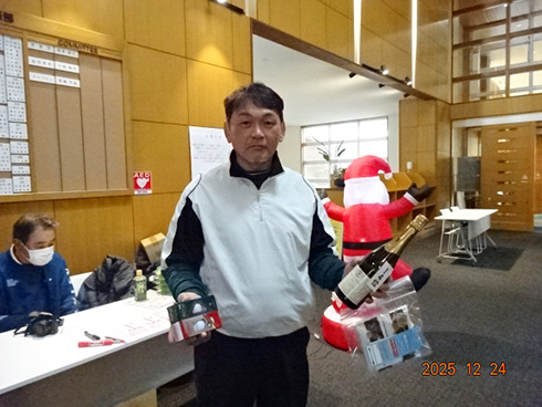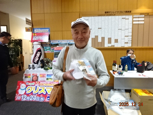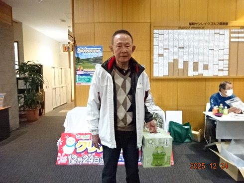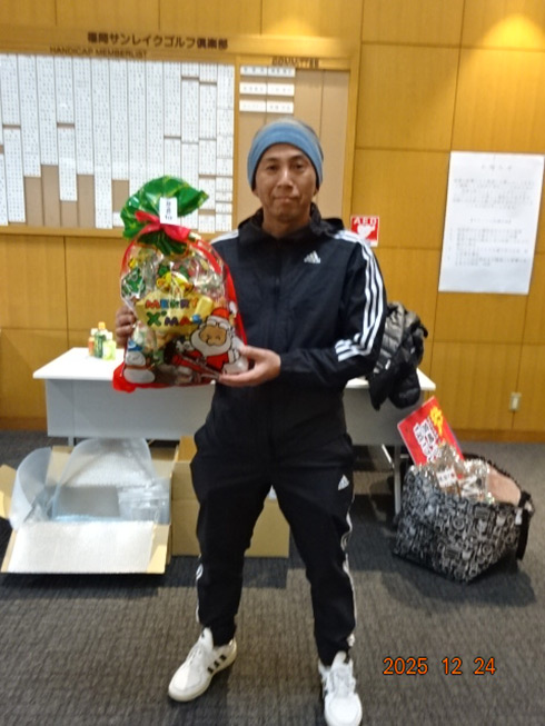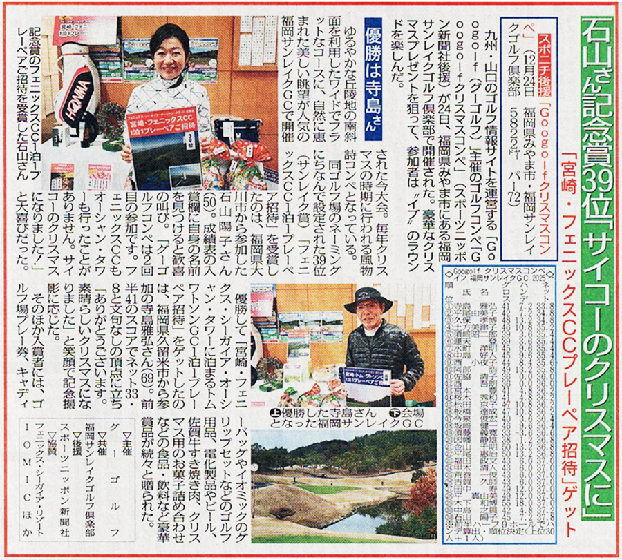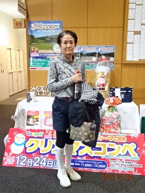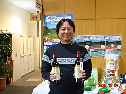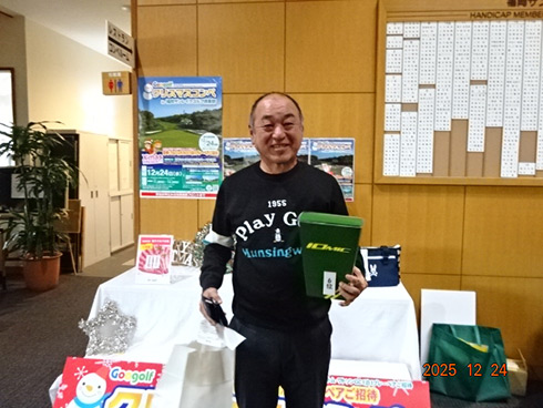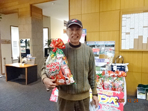 また、優勝して「宮崎・フェニクス・シーガイア・オーシャン・タワーに泊まるトムワトソンGC1泊1プレーペアご招待」をゲットしたのは福岡県久留米市から参加の寺島雅弘さん(69)。前半41のスコアでネット33.8と文句なしの頂点に立った。ベストスコアは76という寺島さん「ありがとうございます。素晴らしいクリスマスになりました」と笑顔の記念撮影。