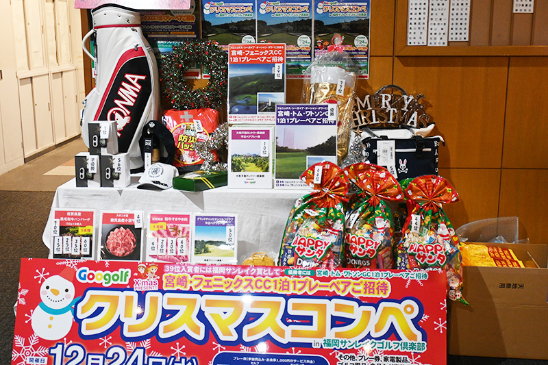 入賞者には、その他、ゴルフプレー券、キャディバッグやイオミックのグリップセットなどのゴルフ用品から電化製品、ビールや佐賀牛すき焼き肉、クリスマス用のお菓子詰合せなどの食品・飲料まで豪華賞品が贈られた。