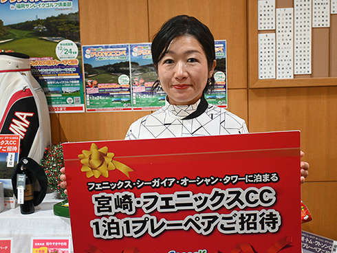同ゴルフ場のネーミングにちなんで設定された39位(サンレイク賞)の「フェニックスCC1泊1プレーペアご招待」を受賞したのは、福岡県大川市から参加した石山陽子さん(50)。成績表の39位に自分の名前を見つけると歓喜の叫び。素晴らしいクリスマスプレゼントになったようだ。「グーゴルフコンペは2回目の参加です。フェニックスCCもオーシャン・タワーも行ったことがありません。サイコー!のクリスマスになりました」と大喜び。