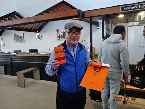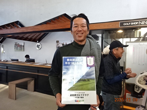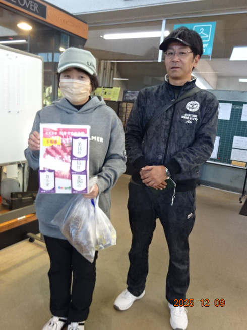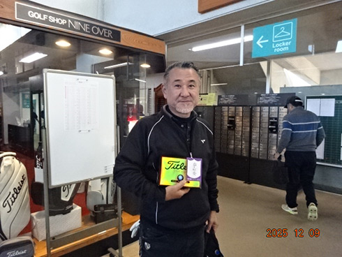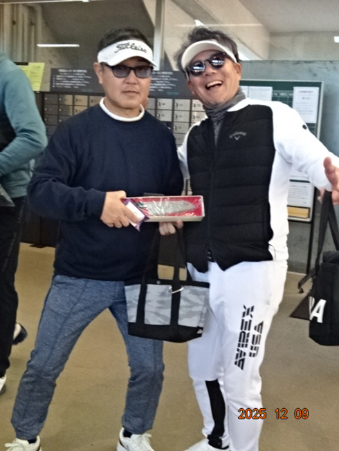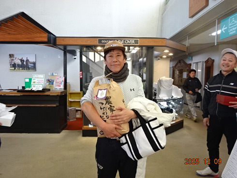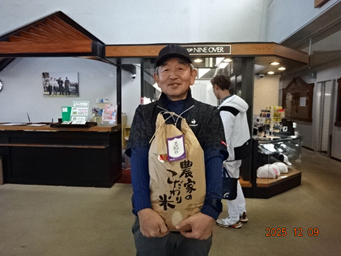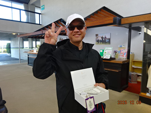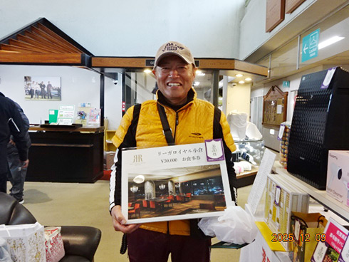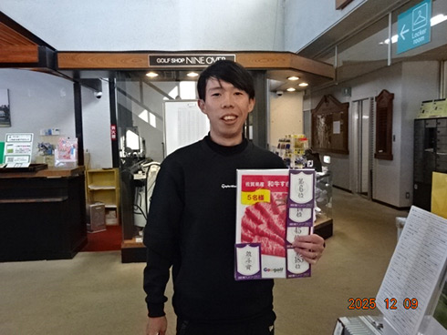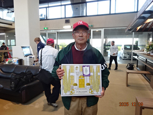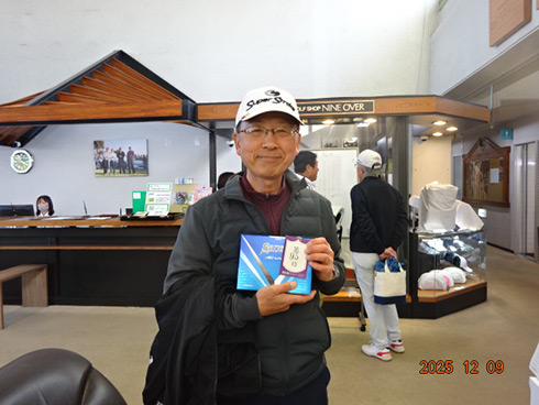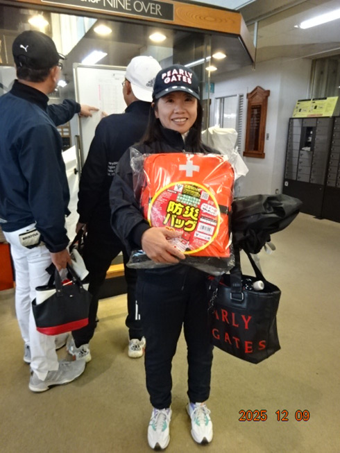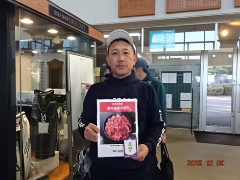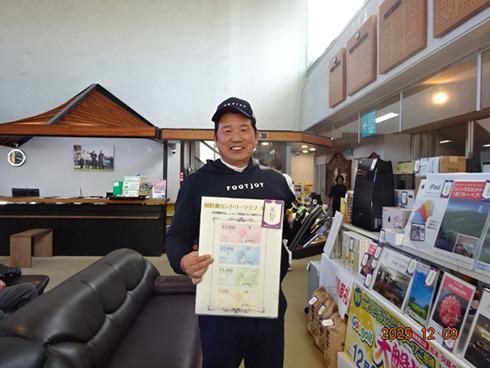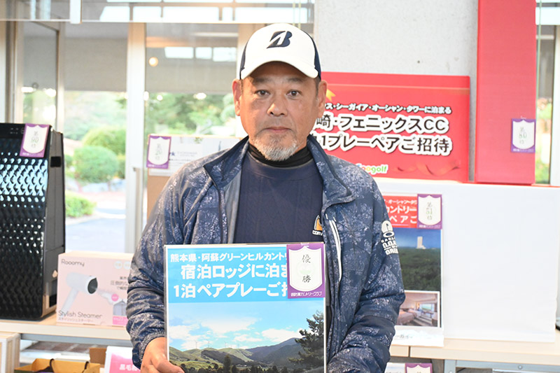 優勝して阿蘇グリーンヒルカントリークラブ1泊1プレーペアご招待をゲットしたのは、福岡県京都郡から参加した末廣静人さん(60)。オフィシャルハンデは9という末廣さん「前半8叩いて…。いつもは30台でラウンドするのですが」と前半のスコア42が不満そう。しかしのその8が隠しホールにはまり、ネット33.6で文句なしの優勝となった。