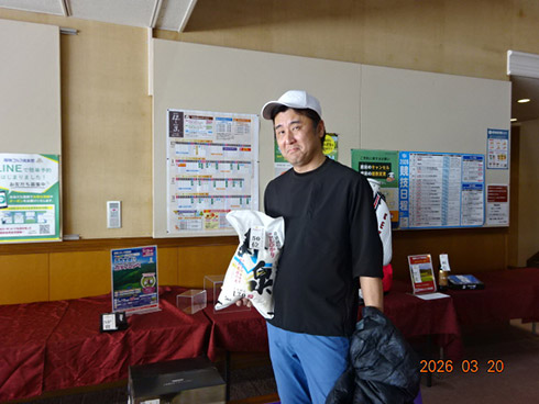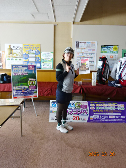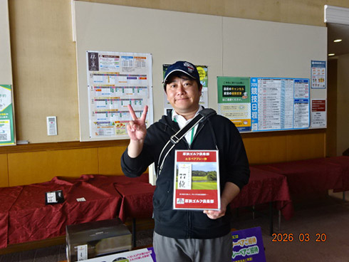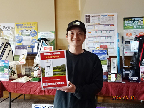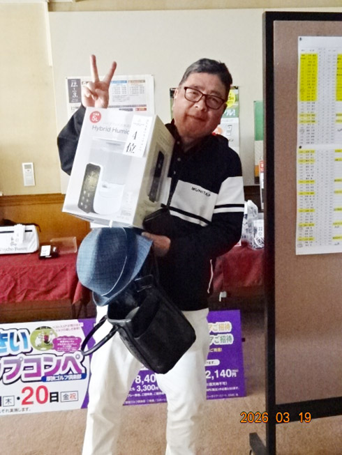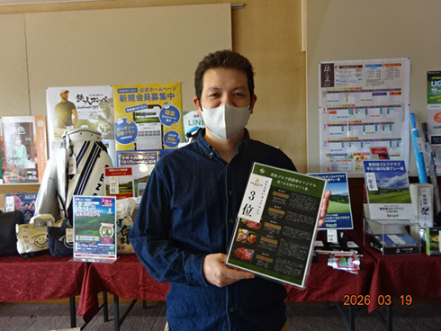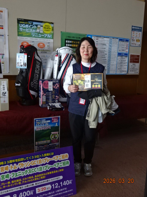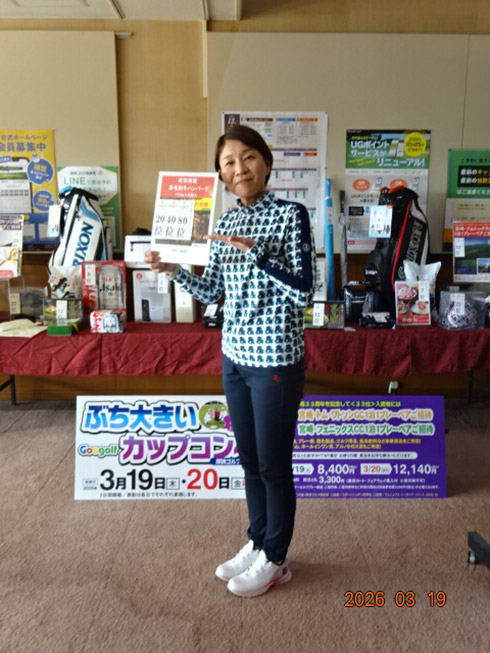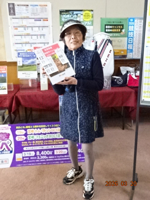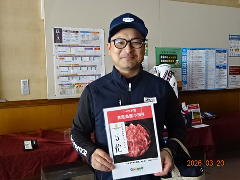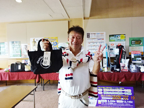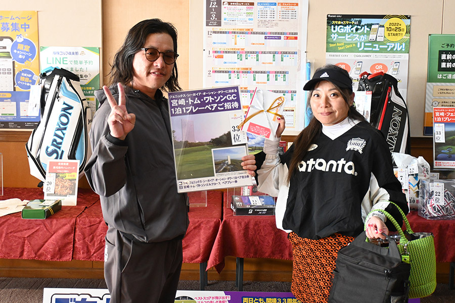 初日33位に入賞し、宮崎シーガイアに泊まるトムワトソンGCペアご招待が贈られたのは、下関市から参加した藤田芳人さん(46)。「ラッキーでした。以前にも厚狭GCのグーゴルフコンペに参加し、宮崎フェニックスCC1泊1プレーが当たり、今回2回目です」と嬉しそう。同伴した奥様も「また宮崎、行ってきまーす」と贈呈された目録を握りしめてニッコリ。