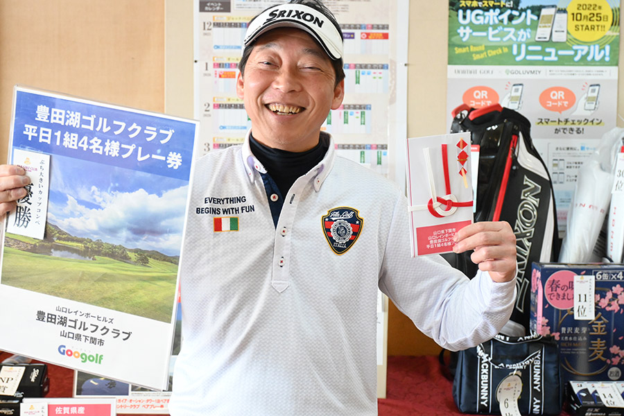 初日優勝は、地元・山陽小野田市から参加した小林義浩さん(63)。「ぶち大きいカップは2回目の参加です。出だし8叩いて・・・」と悔やみながらも、隠しホールにはまった形だ。
