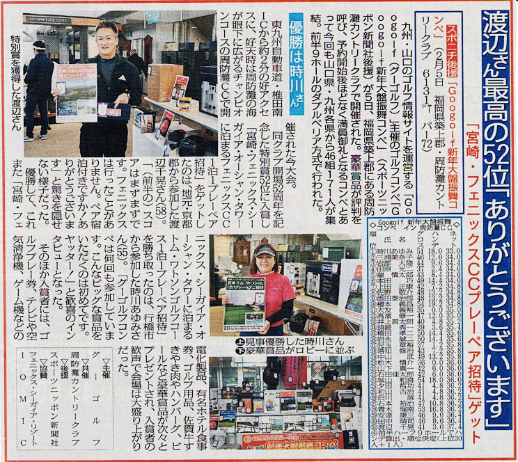 九州・山口のゴルフ場と提携して、ゴルフ情報サイトを運営している「Googolf(グーゴルフ)」が主催するゴルフコンペ「Googolf新年大盤振舞コンペ」(後援/スポーツニッポン新聞社)が2026年2月5日(木)、福岡県築上郡にある周防灘カントリークラブ(6,131ヤード、パー72)で開催された。