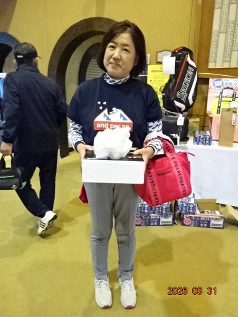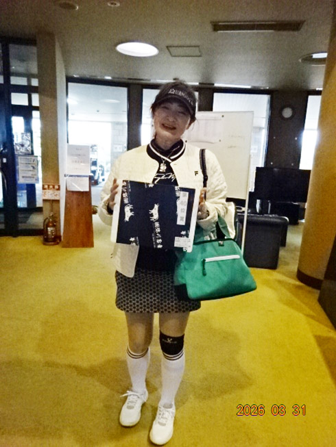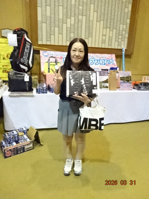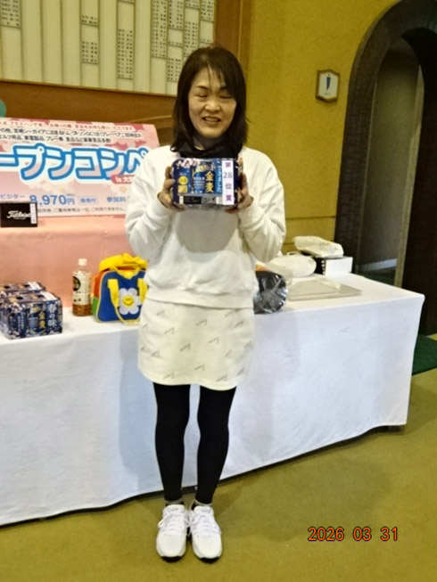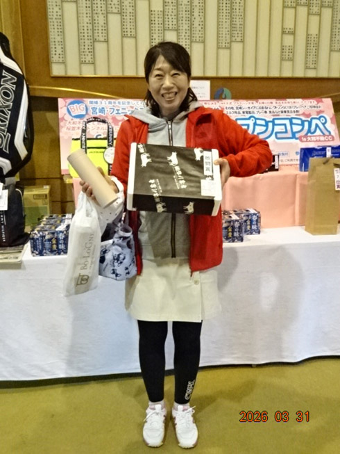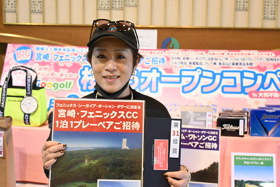 同ゴルフ場開場31周年記念賞の「宮崎・フェニックスカントリークラブ1泊1プレーペアご招待」を受賞したのは、福岡市から2組で参加した杉原杏奈さん(45)。ゴルフ歴は12年だがオフィシャルハンデが9.2という強者。グーゴルフコンペの参加は2回目という杉原さん「フェニックスCCは、行ったことがありません。今日は誰か宮崎が当たるといいねと参加しました。宮崎ゴルフ旅行、めちゃ楽しみです。今日の仲間と行って来ます」とニッコリ。