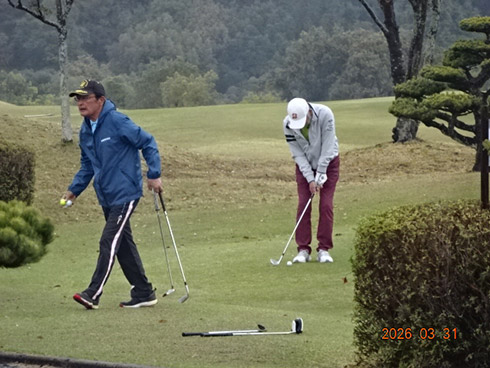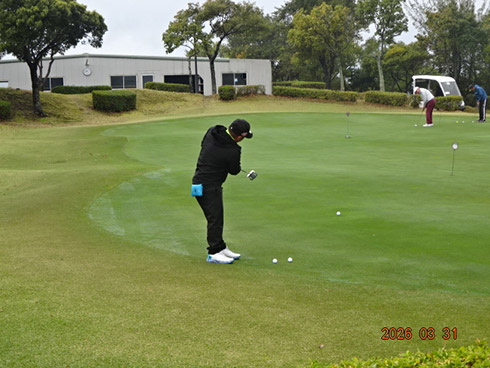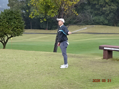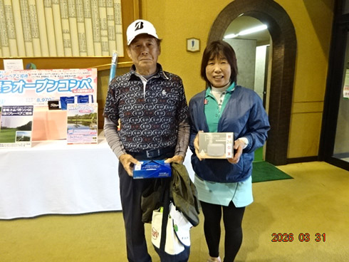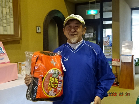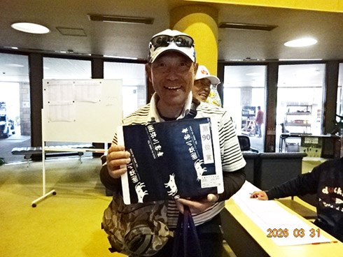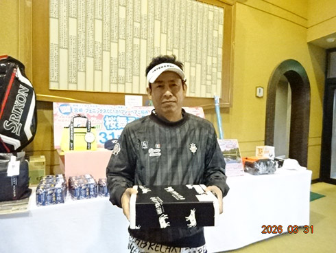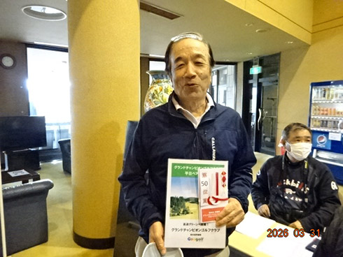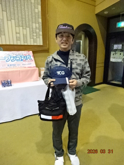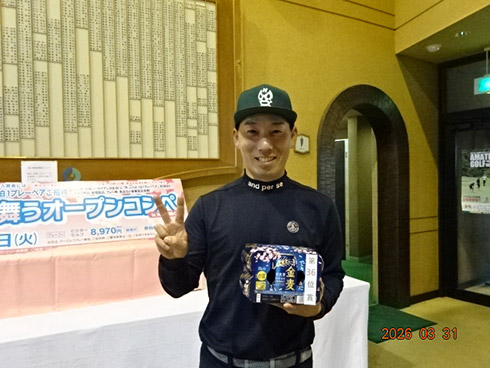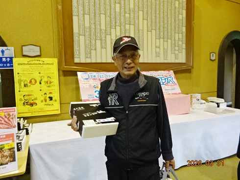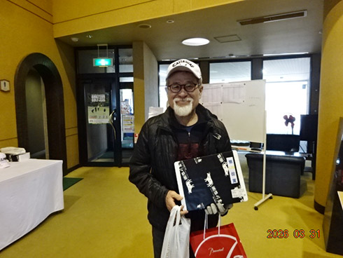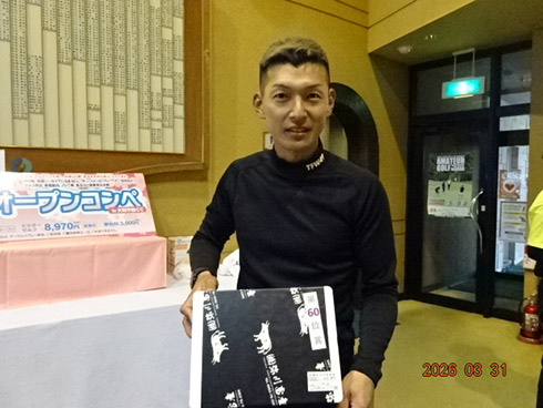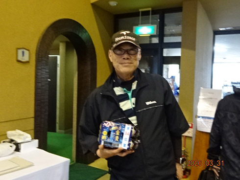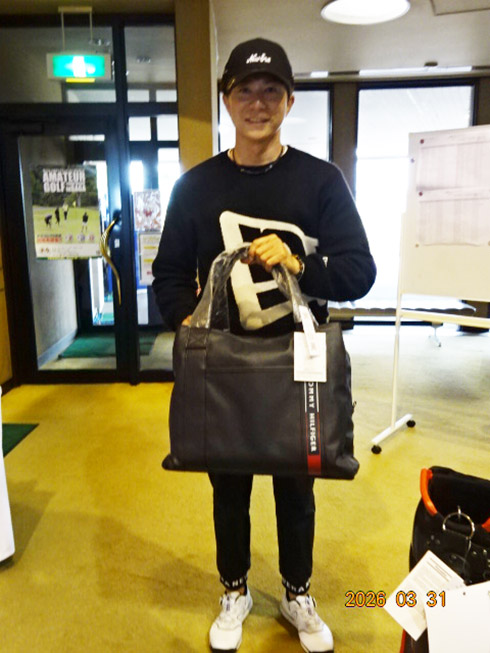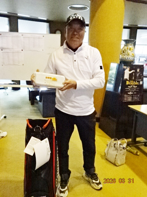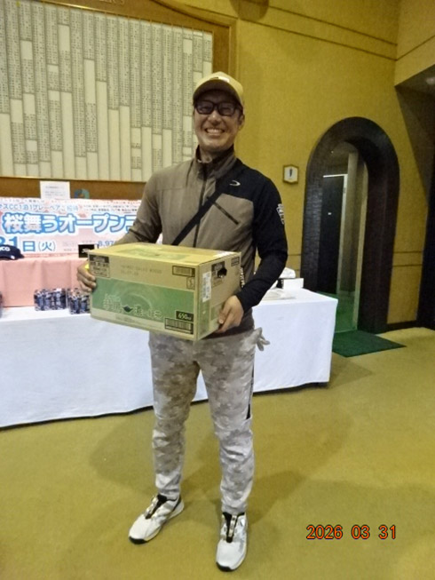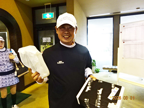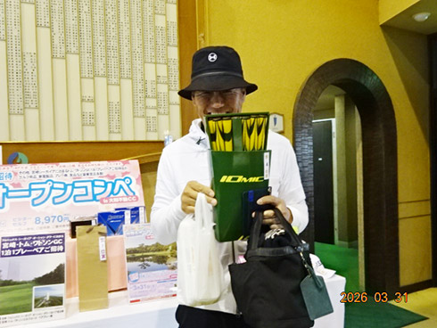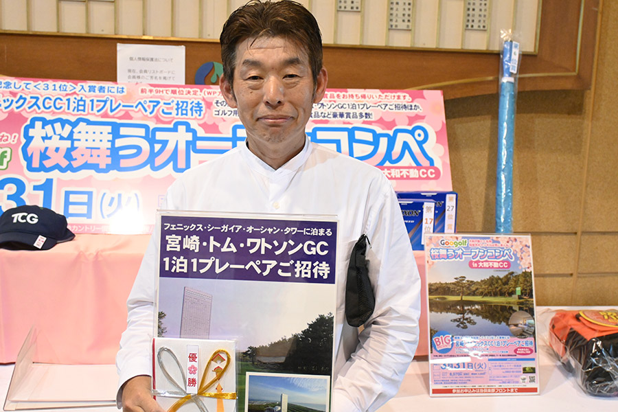優勝して、宮崎シーガイアに泊まるトム・ワトソンゴルフコース1泊1プレーペアご招待を獲得したのは、筑後市から参加した江崎隆弘さん(54)。「前半を39でラウンド。後半も38でまずまずでした」という江崎さん、ハンデにも恵まれネット33で見事にVを達成した。