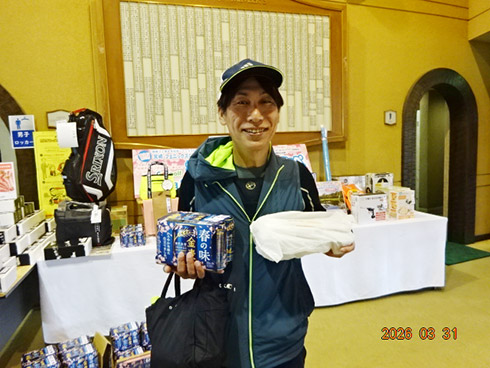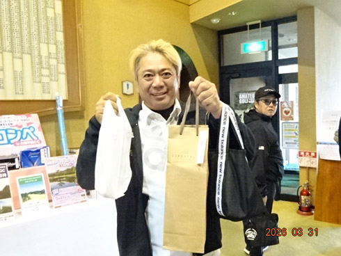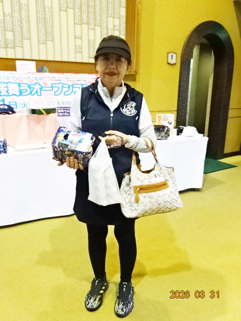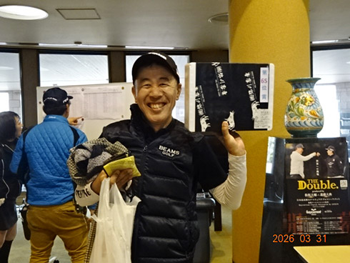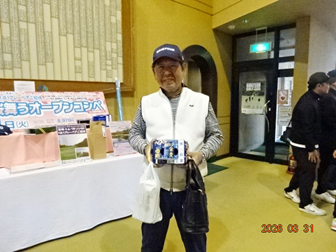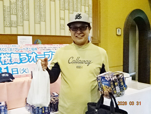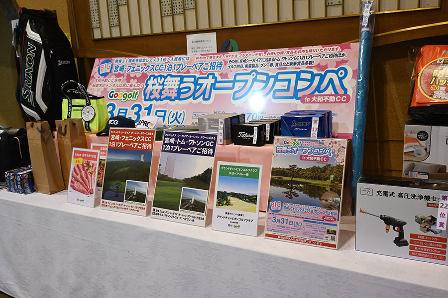 参加者には、桜にちなんで伊藤園の「さくら緑茶」やレストランでは「杏仁豆腐」が振舞われ、佐賀県産すきやき肉、黒毛和牛ハンバーグや金麦桜バージョンのビールなどの食品飲料から、プレー券、イオミックのグリップセットなどのゴルフ用品、家電まで多種多彩の豪華賞品が次々とプレゼントされた。