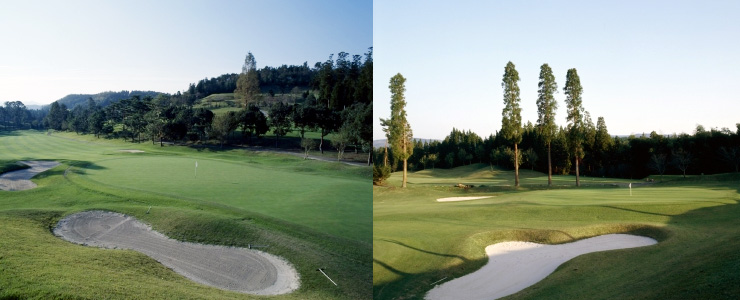 天瀬温泉CCは、OUTコースからは万年山が、INコースからは釈迦岳が望める、雄大な自然に囲まれた地に展開されています。そのためコース設計はありのままの自然を生かした絶妙なもので、高い戦略性を秘めています。